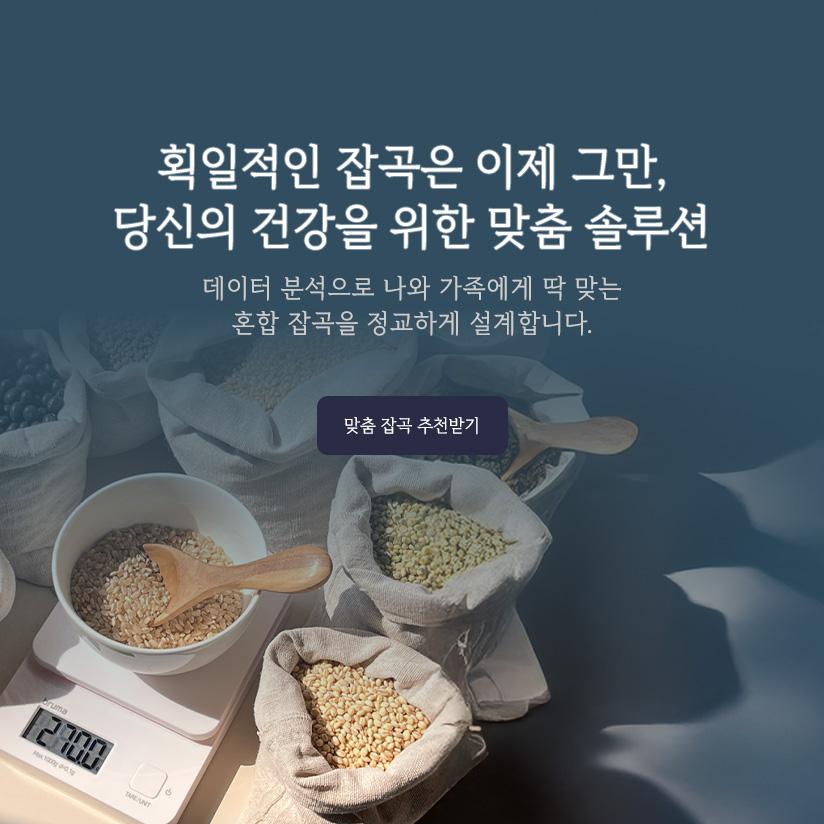 누구에게나 같은 혼합잡곡이 아닌 나와 가족에게만 집중된 곡물을 추천 받아보세요.